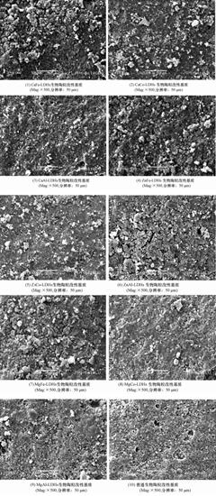 圖 1為9種改性生物陶粒基質和普通生物陶粒基質的SEM圖.將不同改性方式的生物陶粒基質(1~9)與普通生物陶粒基質(10)SEM圖譜對比分析后發現,改性后的生物陶粒基質表面分布著數量 不等的白色物質,且每種改性方式對應的LDHs改性基質表面呈現出不同的形態,其在基質上覆膜的效果也有所差異.其中,1號CaFe-LDHs、2號CaCo-LDHs、4號ZnFe-LDHs、5號ZnCo-LDHs和6號ZnAl-LDHs改性基質表面白色顆粒較多.