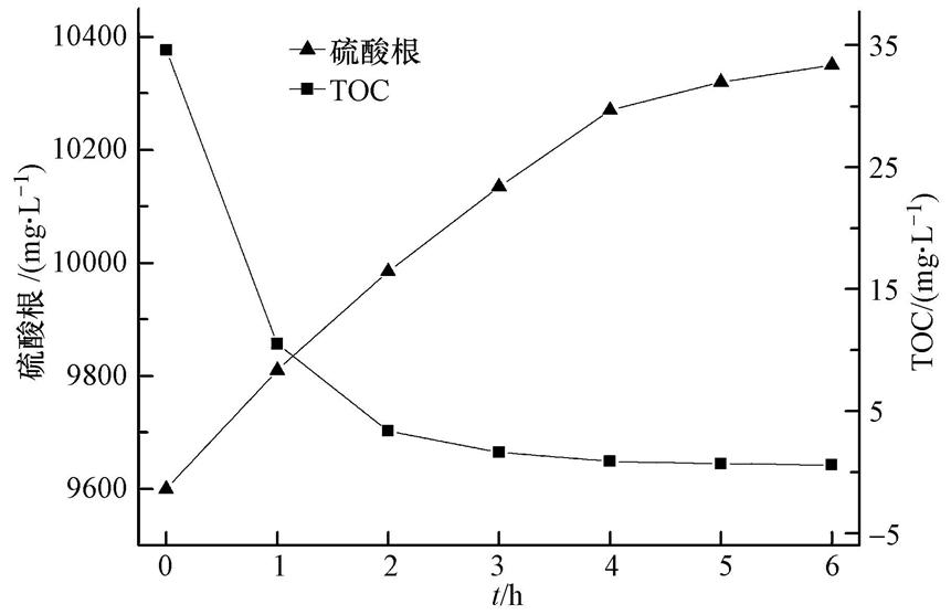 PS氧化反應過程中由于投加PS氧化廢水中的難降解有機物,反應過程中溶液的各組分發生了變化,主要包括無機和有機成分的變化.無機組分的變化主要是指ROC中的硫酸鈉隨著反應的持續進行濃度不斷升高.從圖 4可以看出,在投加1000 mg · L-1的PS條件下,6 h后出水硫酸根的濃度上升到10350 mg · L-1,出水回用于印染工藝,濃水中的高濃度硫酸鹽不僅沒有浪費,而且得到提升并作為染色助劑應用,減少染色工藝投加硫酸鈉10 g · L-1以上,硫酸鈉市場成本為0.68元· kg-1,節約成本6.8元· m-3.有機組分的變化主要是指ROC中的難降解有機物在PS作用下不斷礦化的過程.ROC中的TOC在4 h的反應時間內降低到1.0 mg · L-1以下,表明經PS氧化后廢水中的難降解有機物數量明顯減少,實現了難降解有機物的基本礦化.