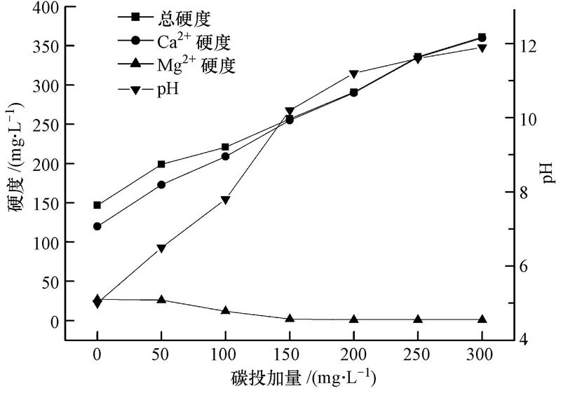 由于Mg(OH)2的Ksp(1.8×10-11)比Ca(OH)2的Ksp(5.5×10-6)小5個數量級,石灰投加入溶液中以后,生成更難溶的Mg(OH)2沉淀使溶液中的鎂離子得到去除(蔡明招等,2009).溶液中的總硬度、鈣硬度、鎂硬度和pH隨石灰投加量的變化見圖 4.總硬度、鈣硬度和溶液的pH隨石灰投加量的增加不斷增加,相反地,鎂硬度卻在不斷降低.當石灰的投加量增加到150 mg · L-1時,溶液的pH達到10.2,鎂硬度降低到1.2 mg · L-1,繼續投加石灰,鎂硬度變化不大(p>0.05),表明石灰投加量已滿足溶液中Mg2+的去除,確定此反應體系適宜的石灰投加量為150 mg · L-1.