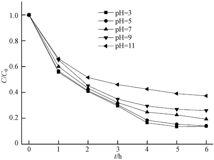 pH對PS降解有機物有一定的影響,楊照榮等的研究表明,PS的氧化能力在堿性條件下比酸性和中性條件下較強,因為在堿性條件下硫酸根自由基會生成氧化能力更強的羥基自由基(· OH,E0=2.80 V),反應如下: