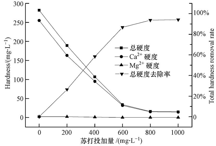 ?圖6 蘇打投加量對硬度和總硬度去除率的影響