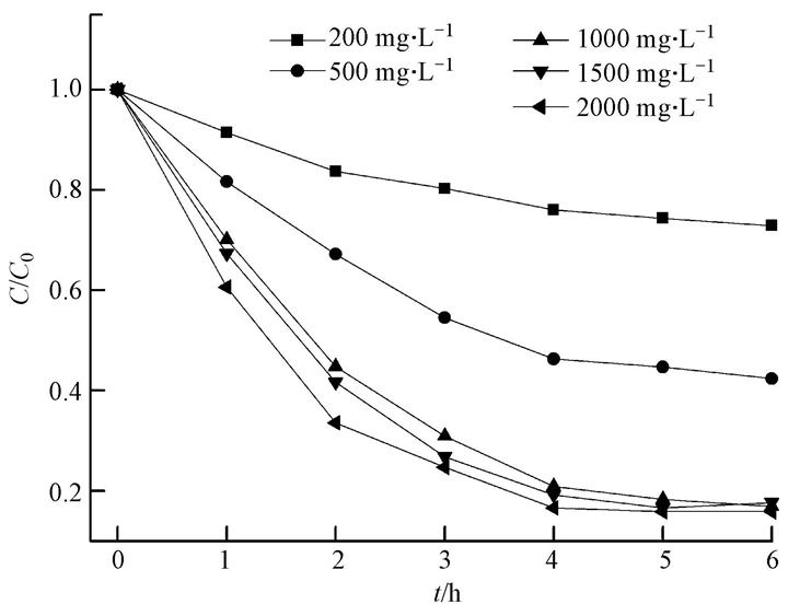 在溫度75 ℃、pH=5的條件下研究了不同初始PS濃度(200~2000 mg · L-1)對ROC中有機物氧化的影響,結果見圖 2.當初始PS濃度從200 mg · L-1上升到1000 mg · L-1時,4 h的反應時間內溶液的COD由98.3 mg · L-1降低至21.5 mg · L-1,表明初始PS濃度對印染ROC中難降解有機物的降解有很大影響,印染ROC中難降解有機物的降解速率隨PS初始濃度的升高而逐漸升高(p<0.05).當初始PS濃度由1000 mg · L-1升高到2000 mg · L-1時,溶液的COD變化不明顯(p>0.05),表明1000 mg · L-1的初始PS濃度產生的SO4· -和· OH已基本上能滿足印染ROC中難降解有機物的分解,過量的初始PS量不僅不能增加難降解有機物的降解速率,而且會造成PS的浪費,因此,確定本反應體系最佳的PS初始濃度為1000 mg · L-1.本研究的結果與酸活化PS氧化敵草隆的結果一致,有機物的降解速率隨初始PS濃度的升高而升高,當初始PS濃度增加到一定濃度時,有機物(敵草隆)的降解速率升高不顯著.這可能是由于適量的PS產生了足夠反應體系內有機物氧化產生SO· -4和· OH,過量的PS由于被還原后生成了大量的SO42對PS氧化的抑制作用.