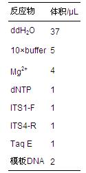 為了鑒別I-5真菌的種類,需提取培養在PDA 上菌絲的DNA,并進行PCR擴增、測序.PCR擴增時采用的引物為通用引物ITS1、ITS4,上游引物ITS1-F: 5′-TCCGTAGGTGAACCTGCGG-3′,下游引物ITS4-R: 5′-TCCTCCGCTTATTGATATGC-3′,PCR反應體系見表 1,反應條件為:95 ℃預變性5 min;94 ℃變性30~40 s,55 ℃退火30~40 s,72 ℃延伸1 min,35個循環;72 ℃延伸5 min.PCR擴增后在瓊脂糖凝膠中進行電泳,將電泳后的凝膠置于Tanon 2500 成像系統中成像.電泳結束后的瓊脂糖凝膠回收純化后送到上海生物工程有限公司進行測序,將測序后的序列與電泳分析圖進行比較確定測定結果是否準確,并在NCBI(National Center for Biotechnology information)上進行核苷酸的比對以確定該菌種的種類.