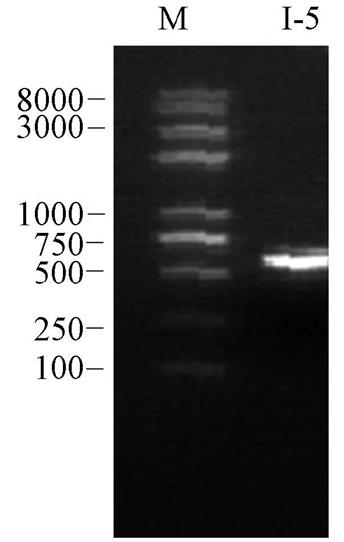 ?圖2 I-5在EB著色的1.5%瓊脂糖凝膠DNA量電泳圖(M是Trans2K Plus DNA 標記物)?
