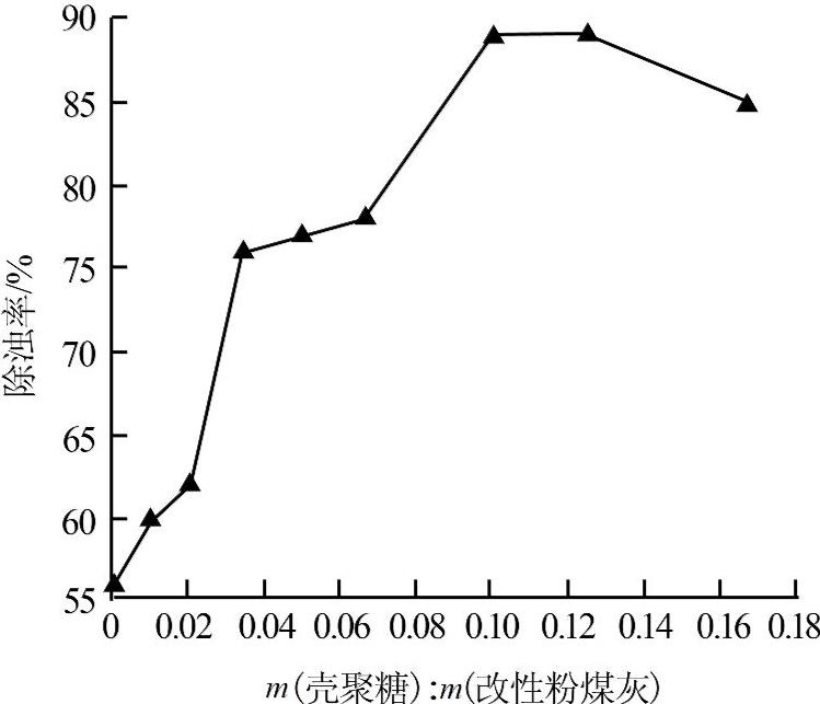 由圖1可知,隨著殼聚糖與改性粉煤灰質量比的增加,廢水除濁率先升高后下降,質量比為0.1時除濁率最高,達到89%。原因主要為改性粉煤灰單獨存在時,其與高嶺土表面的負電荷有一定排斥作用,除濁效果較差,當加入殼聚糖后可產生電中和與架橋作用,其包裹在粉煤灰表面使粉煤灰帶正電荷,與高嶺土表面的負電荷發生電中和作用,有利于吸附和凝聚;但隨著殼聚糖的增加,粉煤灰與高嶺土顆粒表面均被占據,不存在吸附空位,不利于殼聚糖的架橋作用,同時廢水中高嶺土顆粒表面的負電荷被完全中和后,剩余的正電荷使其表面電荷性質反轉,顆粒間斥力增大,不利于除濁。因此殼聚糖與改性粉煤灰最佳質量比為0.1。