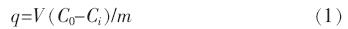 式中: q———腐殖酸的吸附量,mg/g;V———溶液體積,mL;C0和Ci———分別是溶液的初始質量濃度和吸附后溶液質量濃度,mg/L;m———腐殖酸的質量,g?