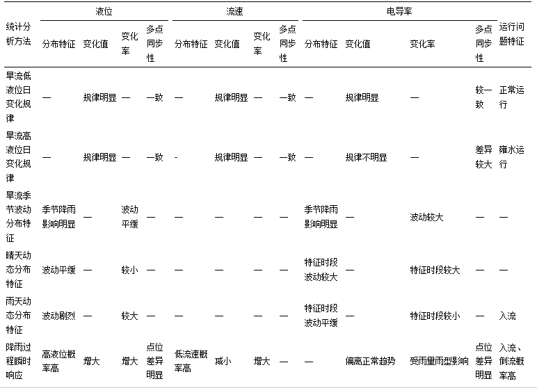 基于長期在線監測,結合連續數據解析方法處理得到不同指標分布特征、 動態波動特征和不同監測點特異性特征,構建混流制管網運行特征庫(表 1),為管網運行管理和故障診斷工作提供數據和信息支持. 基于多指標、 多點協同分析的方法表征了不同情景的特征,對液位、 流速、 電導率的變化值、 變化率、 長期分布特征以及多點同步特征進行了總結,并據此可以實現對管網存在的入流、 倒流問題的定性診斷.具體參見 污水處理技術資料或污水技術資料更多相關技術文檔。