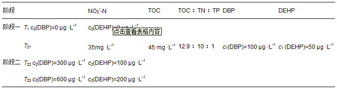 動態實驗中反應器的運行條件為I=300 mA,HRT=12 h,T 20-25℃,pH 7.0-7.5,采用DBP、 DEHP、 CH3COONa、 KNO3和KH2PO4進行人工配水,模擬城市污水廠二級出水質,實驗過程中進水NO3--N、 TOC、 TP濃度保持不變,具體情況見表 1.