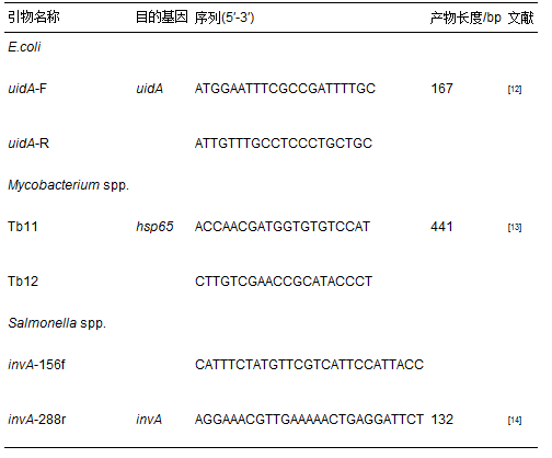 本研究中大腸桿菌和分枝桿菌的qPCR檢測(cè)采用SYBR? Green qPCR. 采用Taqman? qPCR定量檢測(cè)沙門氏菌. 所采用的目的基因和相應(yīng)引物序列見表 2.