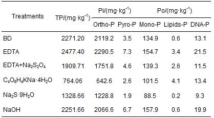 利用液相31P-NMR對(duì)NaOH提取液進(jìn)行分析得到5種磷組分,分別是正磷酸鹽(Ortho-P: 6~7 ppm)、焦磷酸鹽(Pyro-P:-3.5~-4.5 ppm)、磷酸單酯(Mono-P:4~6 ppm)、磷脂(Lipids-P:1~ 3 ppm)和DNA-P(DNA-P:0~-1 ppm)(圖 3).從圖譜分析可以看出,提取劑對(duì)沉積物磷形態(tài)并沒有產(chǎn)生影響,提取劑前提取后,均可以得到5種磷形態(tài). 不同提取劑對(duì)沉積物中不同磷形態(tài)含量造成的影響存在差異.EDTA和BD處理后顯著提高了沉積物NaOH提取液中Pi的提取量.EDTA處理后提高了沉積物NaOH提取液中焦磷酸的量;5種提取劑處理后并沒有提高磷酸單酯的量.EDTA、EDTA+Na2S2O4和C4O6H4KNa · 4H2O 3個(gè)處理顯著提高了磷脂的含量,分別由0.63 mg · kg-1增加到3.44、2.58和4.09 mg · kg-1;對(duì)DNA-P而言,僅EDTA處理提高了其含量(表 3).