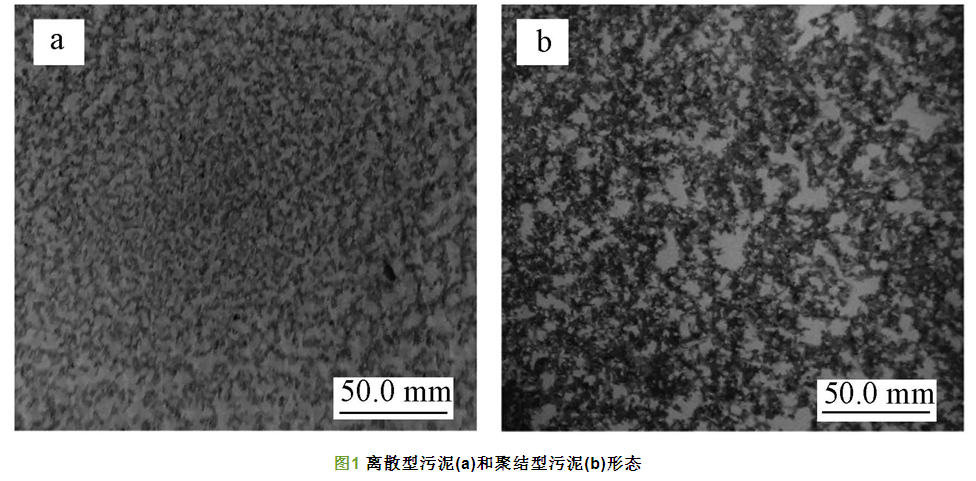 通過旋流分離裝置分離得到聚結型污泥與離散型污泥后立即進行掃描觀察,結果如圖 1所示.由圖 1可知,兩種污泥均呈絮體狀,外型不規(guī)則.相比而言,聚結型污泥結構更為密實,絮體之間連接緊密,而離散型污泥絮團較小,結構更為松散.兩種污泥常規(guī)指標如表 1所示,離散型污泥與聚結型污泥SVI值分別為78.9與56.0 mL · g-1. SVI即污泥體積指數,是衡量活性污泥沉降性能的指標,聚結型污泥SVI值低于離散型污泥表明其污泥沉降性能更好,污泥比重更大.