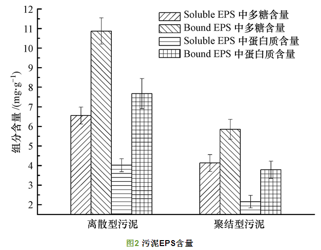 采用2.3.2節(jié)中所述方法測定兩種污泥的胞外聚合物,結果如圖 2所示.胞外聚合物是微生物細胞分泌的粘性物質,主要成分為多糖和蛋白質等物質.其中,Bound EPS主要是緊密結合在細胞外殼的束縛性聚合物及附著有機物,Soluble EPS主要是可溶解的大分子物質、膠體和粘液. 數據顯示,離散型污泥單位質量MLVSS中的Bound EPS和Soluble EPS更高,這一結果與其他學者的研究結果相符.EPS的含量與污泥的沉降性能呈負相關.離散型污泥EPS含量更高,導致污泥表面電負性較大,絮體表面的凈負電荷可以在絮體之間產生排斥勢能,導致污泥結構變得松散.