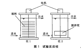①試驗采用2只完全相同的有機玻璃柱,有效體積均為30 L(見圖1)。柱1裝有隨中心軸一起轉(zhuǎn)動的彈性立體填料,柱2不裝填料,由攪拌槳攪拌。電機轉(zhuǎn)速為15~20 r/min,柱上方均設有蓋板。