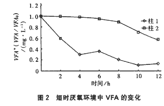 柱1作掛膜運行,HRT=20~30 h,溫度為24~29℃。為了單獨考察城市污水在短時厭氧環(huán)境污水中VFA的變化,試驗未引入小試系統(tǒng)活性污泥。柱內(nèi)微生物完全為厭氧環(huán)境下由污水自然接種生長起來的厭氧或兼性細菌,顯然其厭氧程度較一般脫氮除磷系統(tǒng)的厭氧區(qū)更為充分。柱2作為對比,未作任何處理。正式試驗時,將兩柱瞬時放空,注入新鮮污水,然后啟動電機,每隔2h取樣,分析污水中VFA隨時間的變化規(guī)律,結果見圖2。