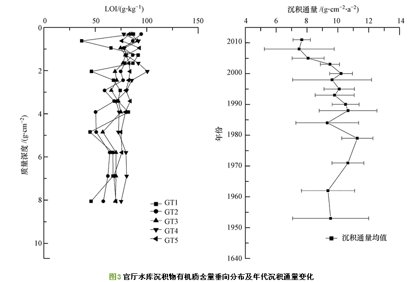 沉積物有機質對污染物的遷移釋放行為起著關鍵性的作用,有機質礦化過程耗氧污染物釋放導致水質惡化,有機質也影響沉積物中重金屬及有毒有機物生態毒性和遷移轉化.通過研究有機質在沉積物中的沉積通量,可以追蹤和剖析污染物歷史沉積變化.本研究以210Pb和137Cs放射性同位素法為測試手段,根據210Pb的衰減規律和137Cs的沉降特征對官廳水庫的沉積速率進行了測定,同時分析了沉積物中有機質及碳氮硫元素垂向分布,初步揭示水質有機質的來源及其污染特征,為研究官廳水庫受人類活動影響的水體污染過程提供參考.