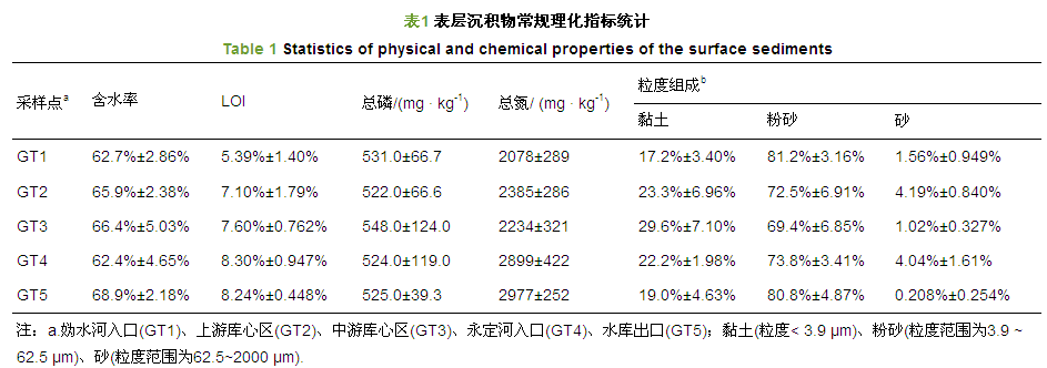 ?????????????? 官廳水庫表層沉積物中各采樣點粒度以粉砂和黏土為主,比例在90%以上,其中,媯水河入口(GT1)和水庫出口(GT5)的粉砂含量均超過80%,上游庫心區(GT2)和永定河入口(GT4)的含砂量相對較高,比例在4%左右.粉砂和黏土代表了水體沉積物中可被再懸浮部分,其表現為垂向加積,是弱水動力的標志,說明官廳水庫水體受到水動力的影響較小.