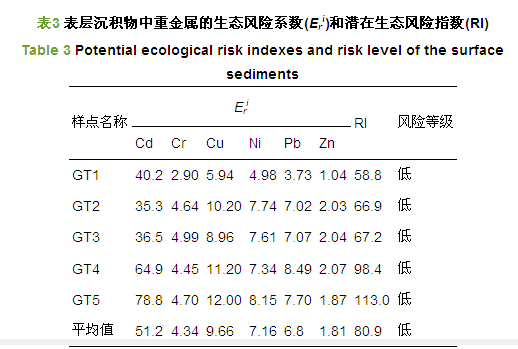 由圖 4可知,表層沉積物中重金屬Cd、Cr、Cu、Ni、Pb和Zn的平均富集系數分別為1.17、1.49、1.33、0.984、0.934和1.24,各重金屬元素富集系數小于1.5,均未發生富集.空間分布來看,各采樣點表層沉積物中不同重金屬的富集系數差異性較大,除媯水河入口(GT1)和永定河入口(GT4)樣點外,其它樣點表層沉積物Cr的富集系數均大于1.5.水庫出口(GT5)樣點的重金屬Cd、Cr和Cu均出現了富集,說明下游的污染相對比較嚴重. 3.3.2 潛在生態風險評價 以北京市土壤背景值作參照,計算官廳水庫表層沉積物中重金屬的單項潛在生態風險指數(Eri)和綜合生態風險指數(RI),結果如表 3所示.從單項潛在生態風險指數來看,其大小依次Cd > Cu > Ni> Pb> Cr> Zn.其中,污染貢獻最大的是Cd,表現為中等生態風險(平均值為51.2),最高值出現在水庫出口GT5(Eri值為78.8),屬于中等生態風險;而其它重金屬元素則均呈現輕微的生態風險.從綜合潛在生態風險指數(RI)來看,官廳水庫出口(GT5)表層沉積物的RI值相對較高,超過100,處于低生態風險;官廳水庫表層沉積物RI值范圍為58.8~113,平均值為80.9,總體屬于低生態風險.
