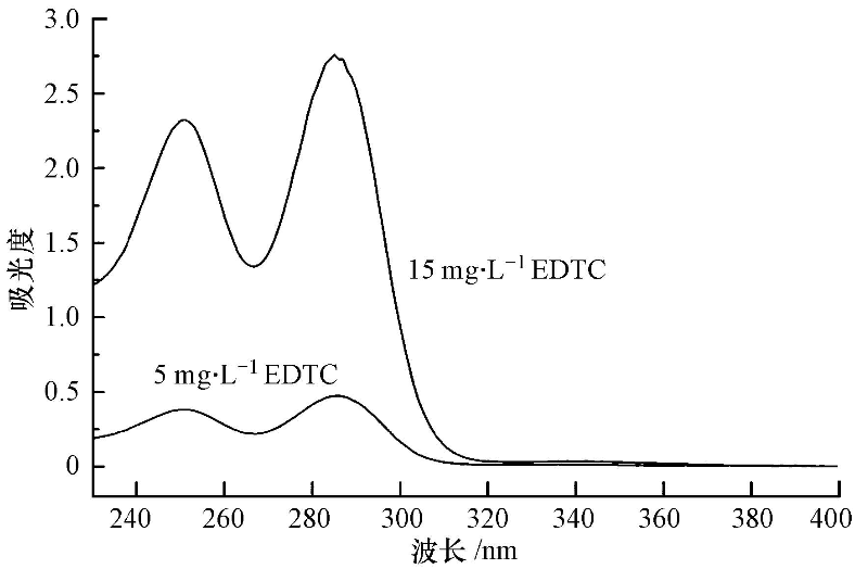 配置5 mg · L-1和15 mg · L-1兩種濃度的EDTC水溶液,以去離子水為參比,220~400 nm段的掃描結果如圖 1所示.由圖 1可知,重金屬捕集劑EDTC在284 nm、251 nm處各存在最大吸收,251 nm處為N—C—S基團的 π-π*躍遷,284 nm處為—CS2基團上的S的非鍵電子向共軛體系的n-π*躍遷,表明碳氮和碳硫之間具有部分雙鍵的結構特征(Tombeux et al., 1972),可初步確定EDTC的主要官能團有C—N、C S及C—S,EDTC上存在二硫代氨基.