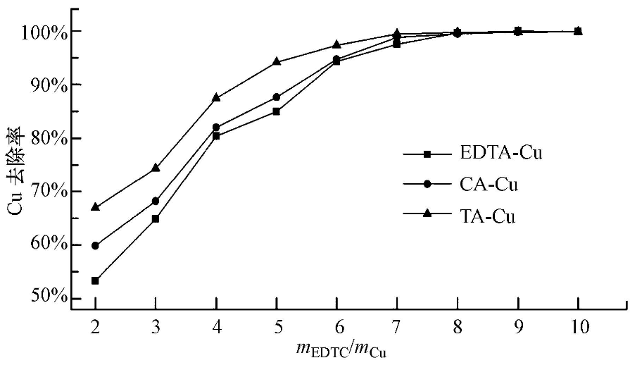 在同一投加量條件下,體系中剩余Cu離子濃度隨著絡合劑的不同呈以下順序:EDTA-Cu >CA-Cu> TA-Cu.Cu的去除效率隨著EDTC投加量的增加而迅速增加;當mEDTC/mCu≥8時,去除率趨于穩定,達到99.5%以上,此時反應體系中的Cu濃度均低于0.25 mg · L-1,低于《電鍍污染物排放標準(GB21900-2008)》中關于 Cu污染物特別排放限值要求(<0.3 mg · L-1).可以看出,EDTC對于3種絡合銅都能有效去除,這表明DTC基團對Cu2+的螯合能力要比EDTA、TA、CA還要強.而繼續加大EDTC投加量,雖然能進一步提升Cu的去除效率,但變化不大,同時考慮到過量的EDTC會增加反應體系COD,當mEDTC/mCu=8時,反應前后反應體系COD由178.5 mg · L-1上升到363.5 mg · L-1,故本實驗得出的EDTC最佳投加量為8倍于廢水中Cu含量,即mEDTC/mCu=8.