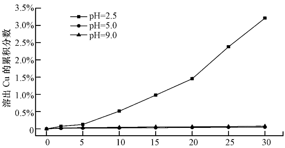 圖 7為在不同pH值條件下螯合沉淀物EDTC-Cu溶出Cu2+的累積分數.SDLT實驗結果表明,在pH值為2.5時,累積溶出銅占總銅量的3.21%,而在pH值為5.0和9.0時,30 d的累積溶出銅僅占0.05%和0.08%.這與令玉林等(2011)用重金屬捕集劑RDTC對含銅廢水進行處理,其沉淀物溶出特性的研究結果相似.由此說明,EDTC能沉淀銅離子且能長期安全放置,不易產生二次污染.