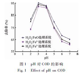 ? 圖1中,3個體系COD的處理效果:H2O2/Fe0體系>H2O2/Fe3+體系>H2O2/Fe2+體系?因為在pH相同的條件下,H2O2/Fe3+體系中,先進行反應(3)生成Fe2+,生成的Fe2+便直接參與到反應(1),并且水中存在的Fe3+數量遠大于Fe2+的,抑制了反應(5),減少了· OH的消耗,提高了Fe2+的有效利用率,使得COD去除率較高;H2O2/Fe0 體系中存在下面的反應[14]: