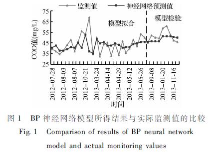 對于建立的BP神經網絡模型,輸入量包括時間?水溫?pH值?氨氮?總氮和總磷,輸出量為COD,隱含層的神經元采用Sigmoid型變換函數,輸出層則采用線性變換函數。而對于神經網絡結構中的各個參數確定則利用學習時間較短?精度與收斂性較好的L-__M算法,隱含層的節點數[15]則根據公式(6)確定:Ny =(Ns +Nj)0.5 +N (6)式中:Ny 為隱含層的節同時,將景觀水體水質監測樣本的數據分為訓練集?檢驗集兩個部分。用訓練集來訓練與擬合BP神經網絡,用檢驗集來對模型的預測結果進行檢驗。本模型中將前3/4的歸一化的數據作為BP神經網絡的訓練集,用后1/4的實際監測值作為BP神經網絡模型的檢驗集。利用MATLAB中的BP神經網絡工具箱,取訓練的最大循環次數epochs=10000,性能函數goal=0,最大驗證數據失敗的次數max_fail=20,最小的性能梯度值mingrad=0.00001。進行不斷地調試,發現在N=2,即隱含層的節點數Ny為4時,模型收斂性最好。模型結果與實際監測值的比較如圖1所示。具體參見污水技術資料更多相關技術文檔。